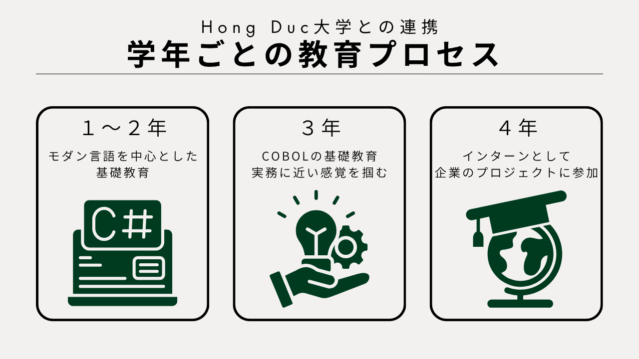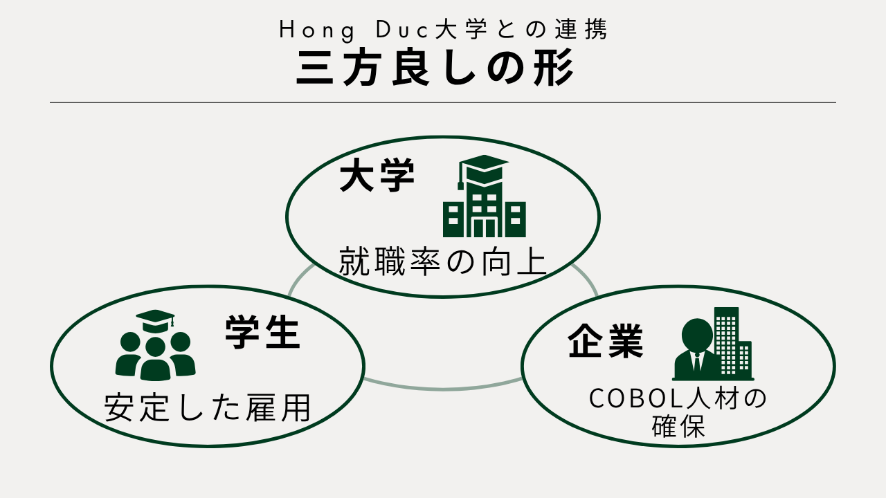 COBOL人材不足は、日本国内だけで解決することが難しい課題です。だからこそ、教育を含めた仕組みを海外に持ち込むという発想が重要になります。ベトナムの大学と連携した人材育成モデルは、その一つの解決策です。