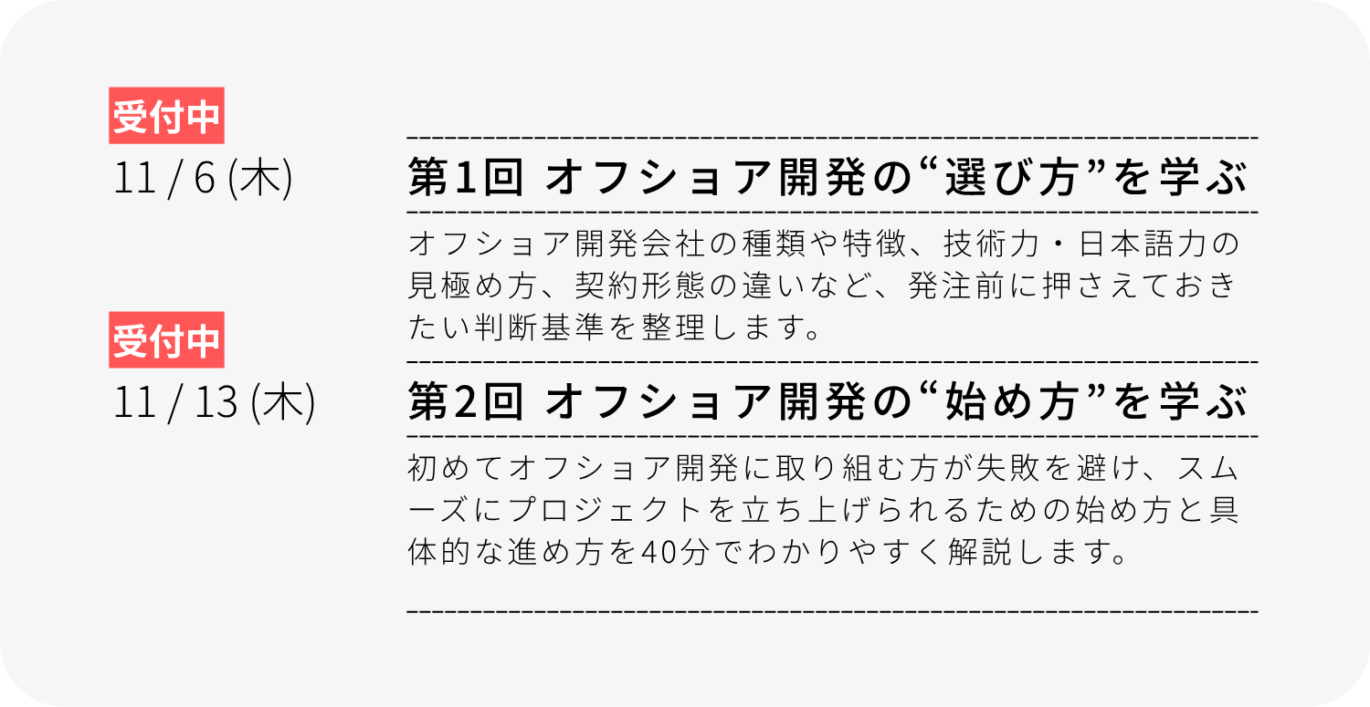 【11月無料セミナー】『全2回:オフショア開発の企業選びと始め方が分かる入門セミナー』を11月6日(木)、11月12日(水)に開催